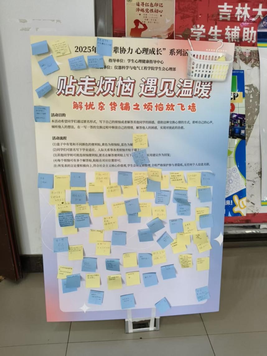 学生会心理部于2025年11月18日至11月25日在李四光教学楼顺利举办了“敞开心扉,放飞烦恼”心理解忧活动。