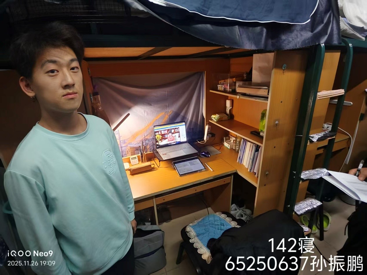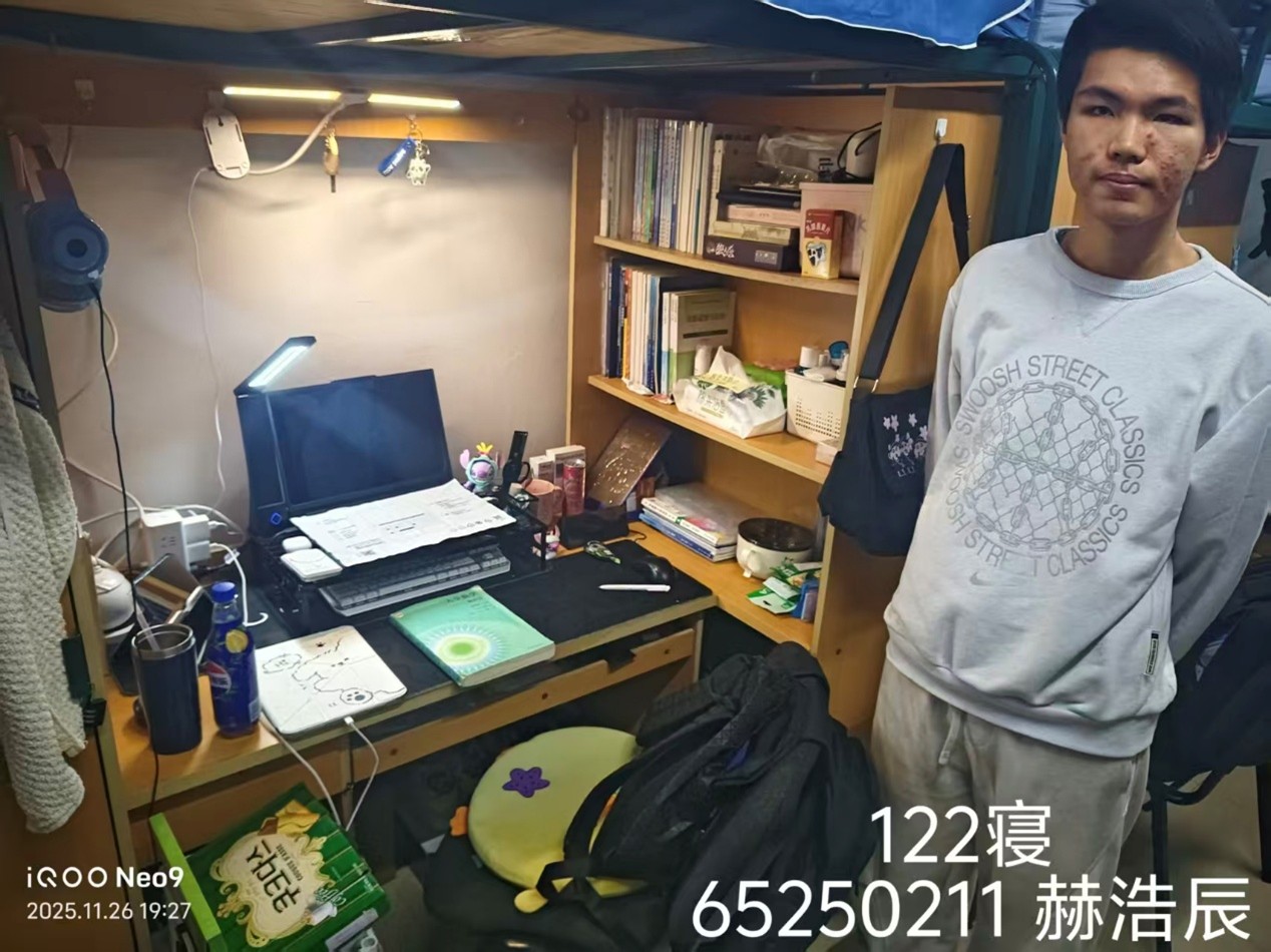 于2025年11月26日针对2025级本科生寝室组织开展了“优秀寝室”评比活动。本次活动由2025级辅导员史博日老师带队,学生会生活部成员参加,对所属年级学生寝室进行了全面深入的走访与检查,并最终评选出8个“优秀寝室”与5名“优秀个人”。
