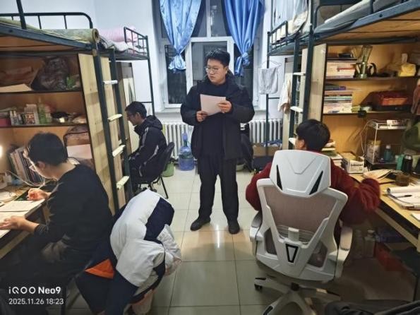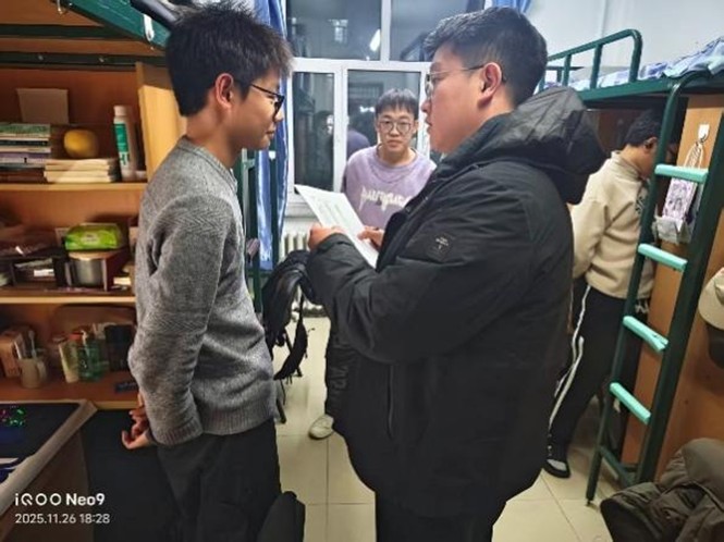 检查团队深入每一间学生宿舍,将评比检查视为一次与学生面对面交流、心贴心沟通的宝贵契机。在检查过程中,史博日老师细致入微地关心每一位同学的学习与生活,在同学的书桌前驻足,翻动书页,亲切询问近期的课程难度与学习压力,关切地了解同学们的饮食习惯与作息规律,叮嘱大家要劳逸结合,保持健康体魄。对于同学们提出的困惑与需求,史老师耐心倾听,并一一给予建议和解答。